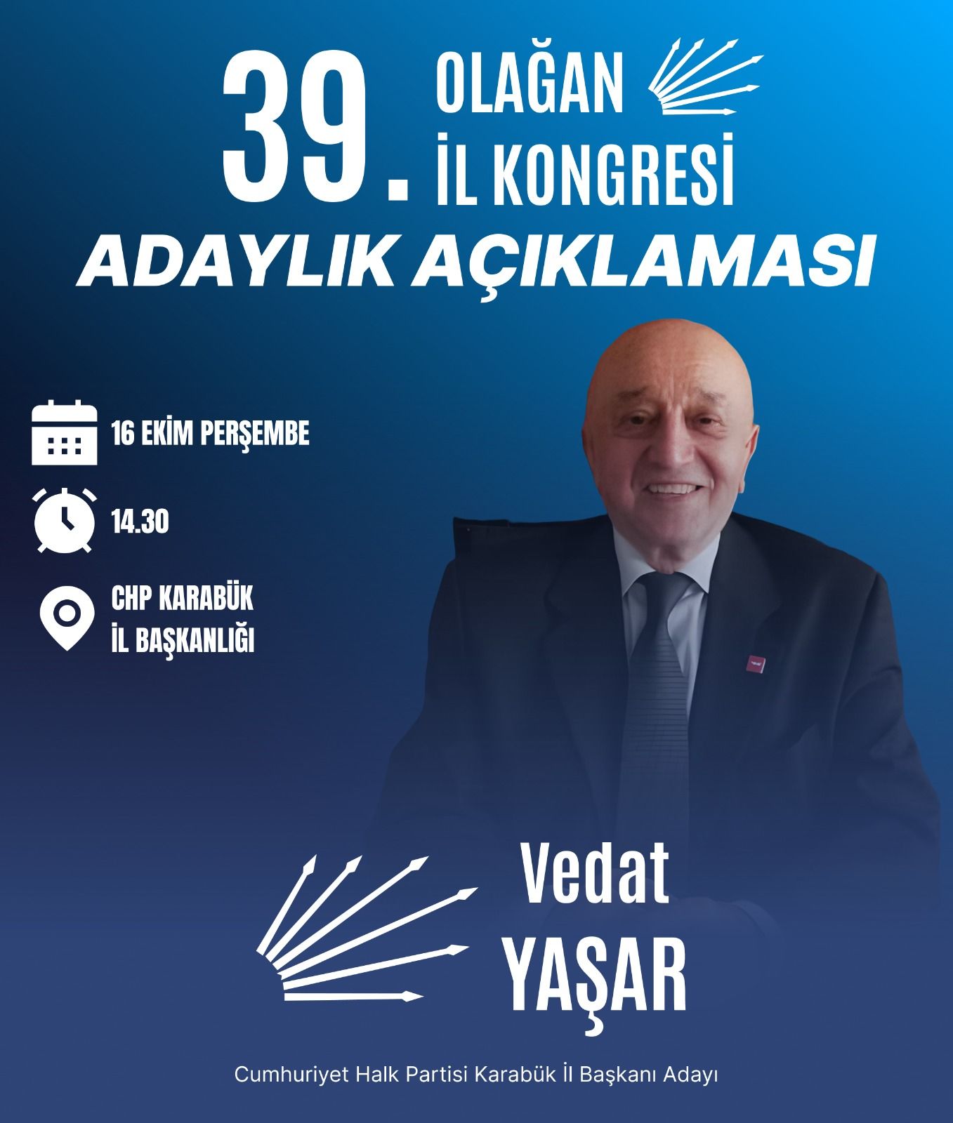 Cumhuriyet Halk Partisi (CHP) Karabük İl Başkanı Vedat Yaşar, yaklaşan il kongresi öncesinde yeniden aday olduğunu açıkladı.